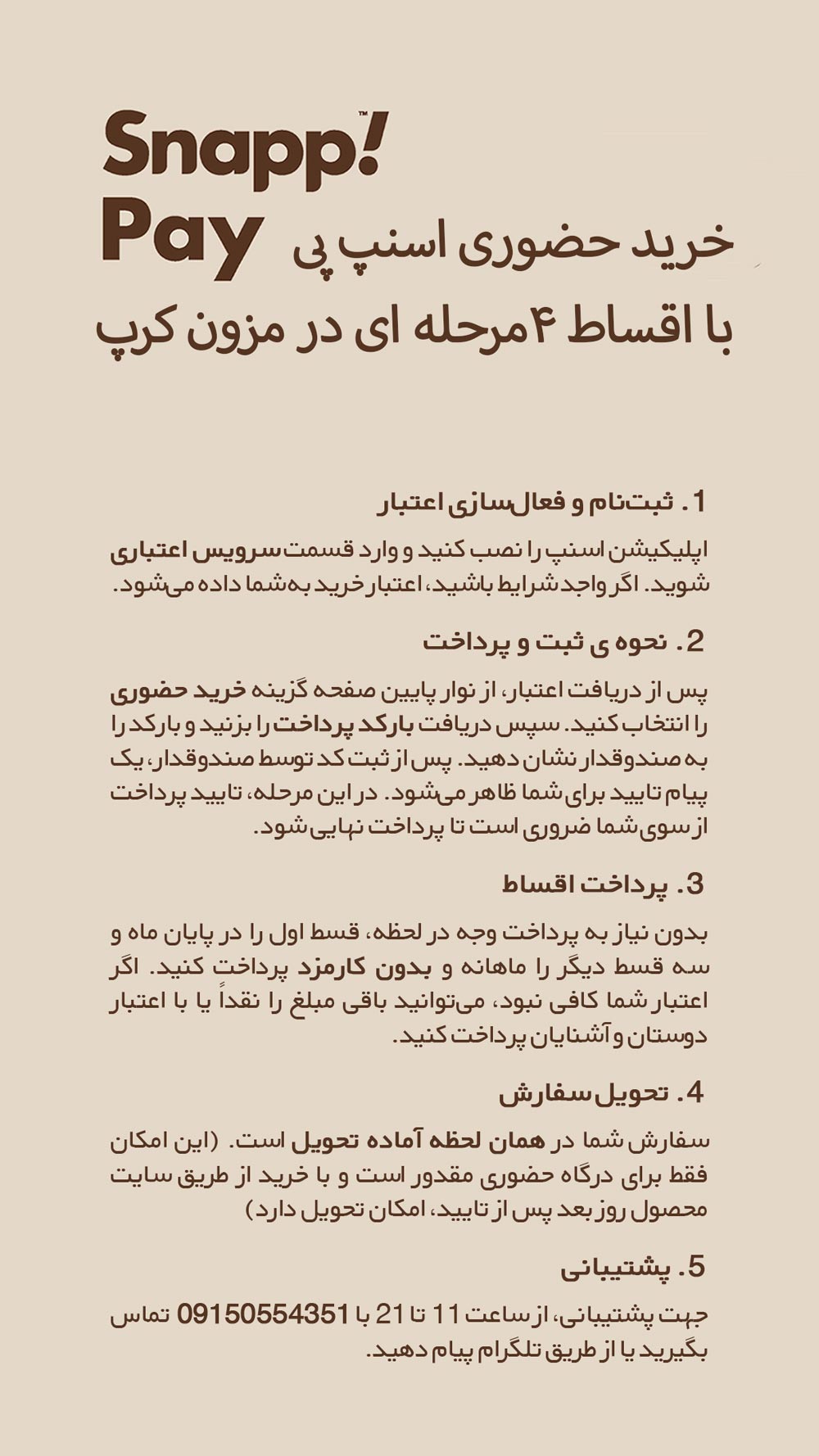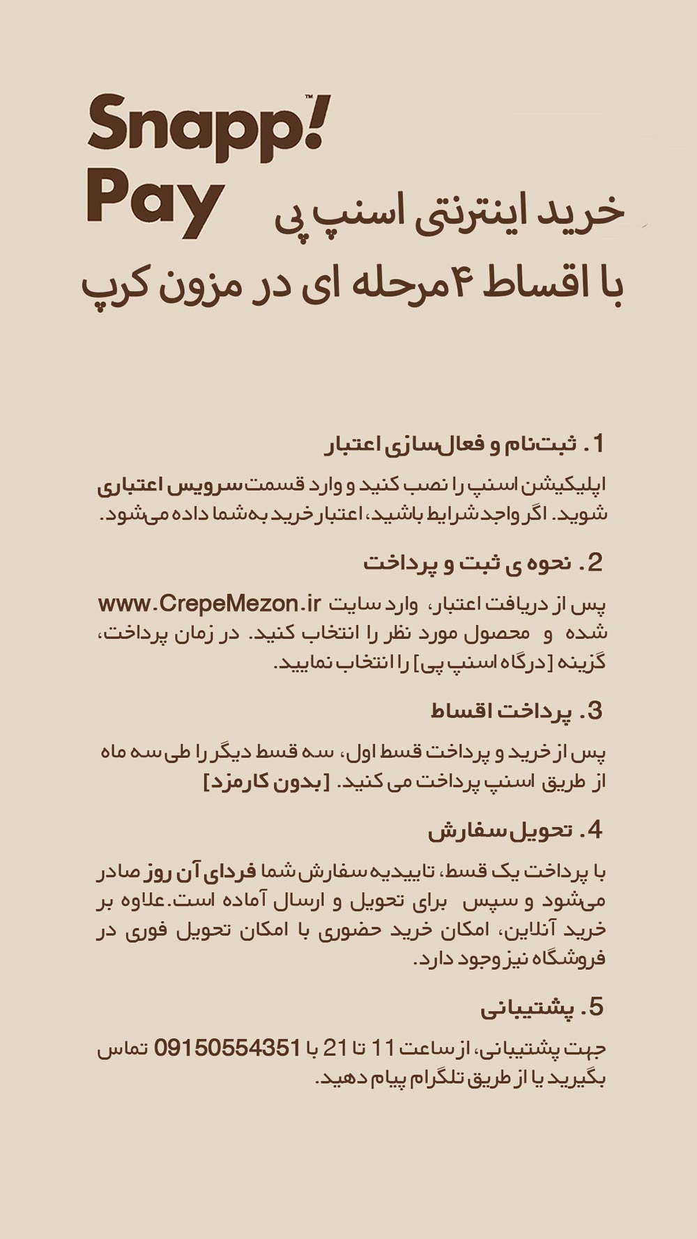 مزون کرپ با افتخار اعلام می دارد که در این راستا نهایت تلاش خود را نموده است تا در کنار کیفیت و برازندگی محصولات، خدماتی را ارائه دهد که با وجود تمامی فشار هایی که اوضاع اقتصادی در جامعه تحمیل نموده است، موضوعاتی مانند خرید کردن هنوز هم مانند قبل باعث خوشحالی و حال خوب برای مشتریان عزیز ما باشد. از این رو با همکاری سوپر اپلیکیشن اسنپ این فرصت مهیا شده است تا سرویس اقساطی را بر روی تمامی محصولات موجود در مجموعه مزون کرپ فعال کنیم و نقشی هرچند کوچک در خوشحالی و انتقال حس خوب به شما عزیزان داشته باشیم. سرویس اعتباری اسنپ پی بهترین پلتفرمی است که بدون نیاز به چک یا داشتن ضامن، امکان خرید اقساطی را فراهم نموده است.