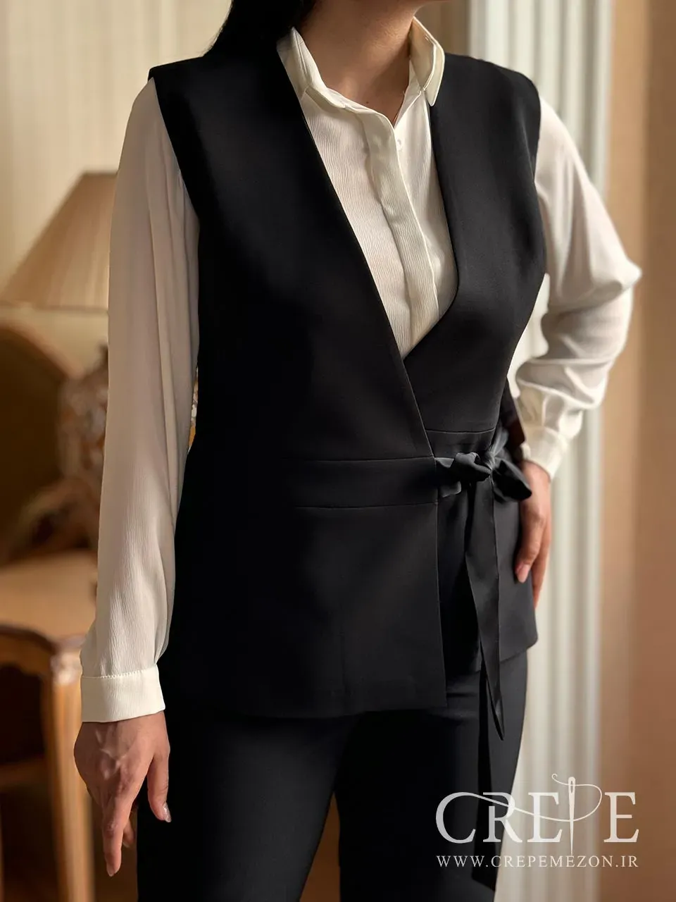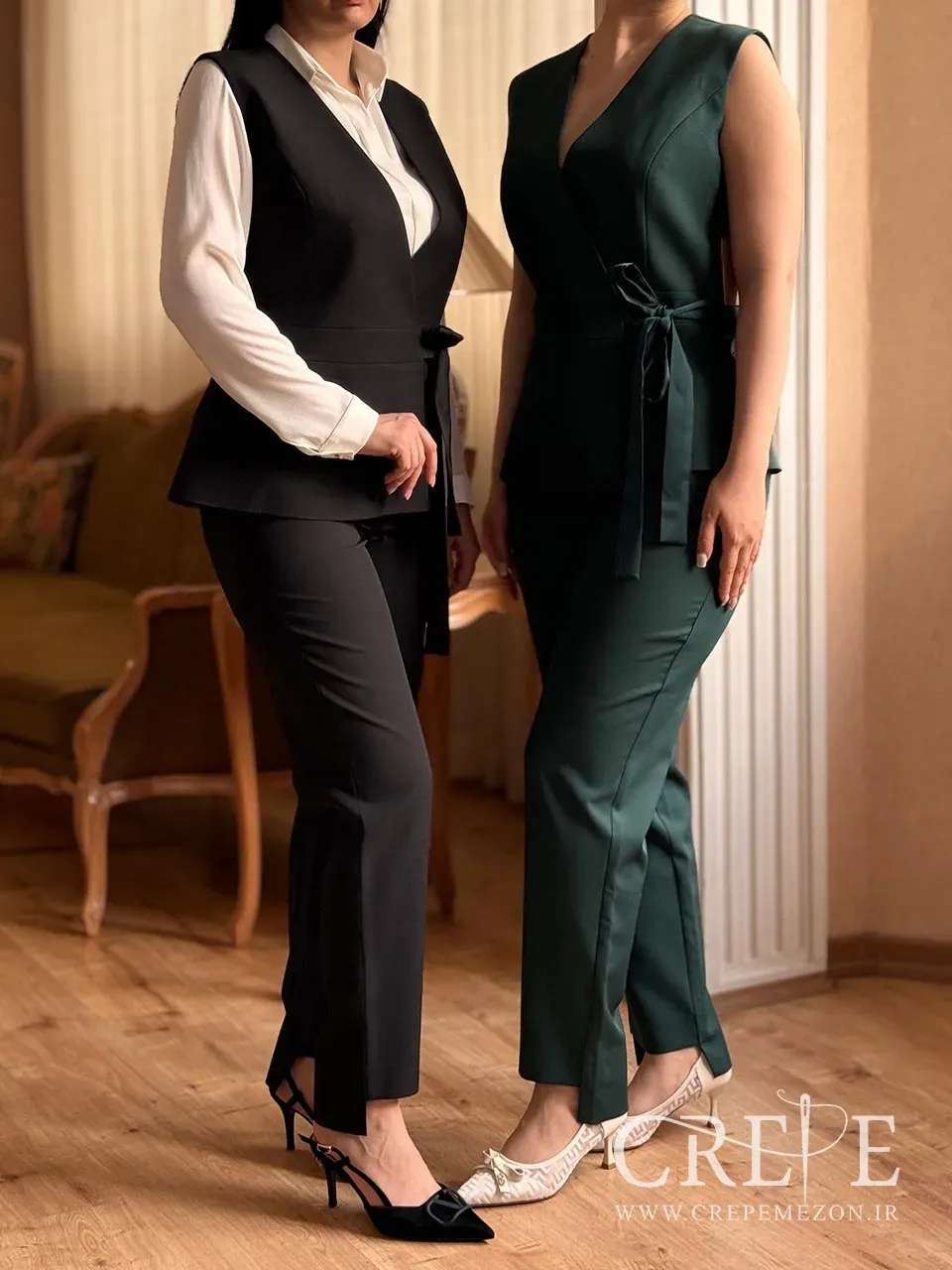 ست وست و شلوار جلو گره ای یک ست دوتیکه فوق العاده شیک که شامل وست و شلوار میباشد، یک گزینه بسیار شیک و مناسب برای موقعیتهای مختلف است. همانطور که در تصویر می بینید وست دارای یقه چپ و راستی است که به طراحی آن جذابیت بیشتری میبخشد. در قسمت پهلو، وست دارای بندی است که به صورت پاپیونی یا ساده میتوان آن را گره زد. این بند علاوه بر زیبایی، امکان تنظیم راحتی و سادگی پوشیدن را فراهم میکند. جنس این ست از کرپ اعلا است که نه تنها احساس راحتی را به همراه دارد، بلکه ظاهری لوکس و شیک را نیز ارائه میدهد. لایه داخلی وست با پارچه کرپ مجدد دوخته شده است که به صورت دو لایه طراحی شده تا ایست محکمتری داشته باشد. این ویژگی به حفظ فرم و زیبایی وست کمک میکند.