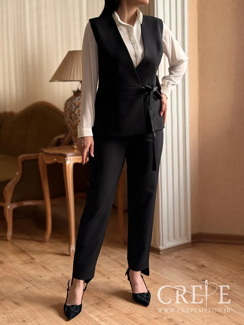 دو طرف پایینی وست دارای آستر است که به کیفیت و جذابیت طراحی افزوده و همچنین باعث راحتی در پوشیدن آن میشود. بندی که دو طرف وست را بهم گره میزند از جنس ساتن میباشد. این جنس نرم و درخشان، به وست جلوهای خاص میبخشد. همچنین شلوار این ست دوتیکه دارای مدل دمپا کلاسیک است که به سادگی و در عین حال شیک بودن کمک میکند. این مدل به راحتی با انواع مختلفی از کفشها و اکسسوریها ست میشود. شلوار همچنین دارای جیب است که برای گذاشتن وسایل کوچک و ضروری بسیار کاربردی است و به راحتی لباس کمک میکند. این ست دوتیکه با طراحی مدرن و کیفیت بالای مواد اولیه، گزینهای عالی برای مجالس رسمی، ملاقاتهای کاری و یا حتی استفاده روزمره است.